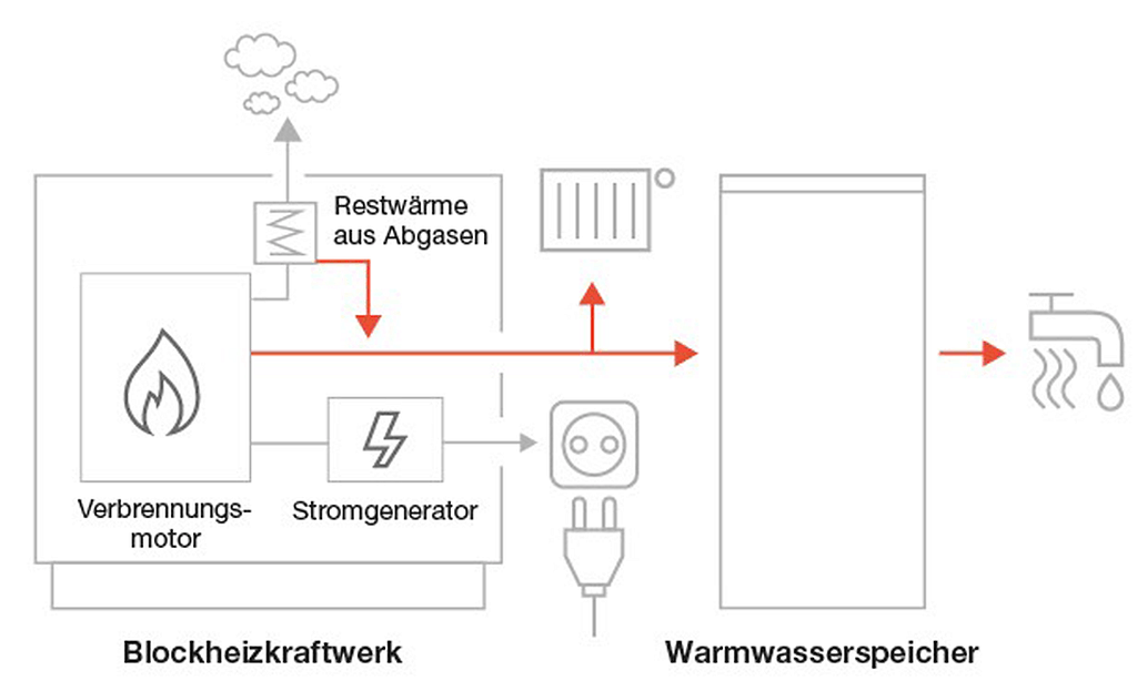 - Zugleich erzeugt der Motor Wärme, welche für die Warmwasserbereitung oder das Beheizen der Räume genutzt werden kann.